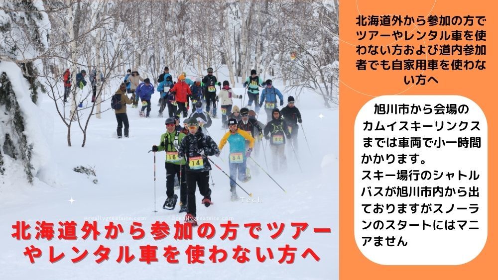 市内よりスキー場までシャトルバスがでております。ただスノーランのスタート時間には間に合いません。ツアーもレンタル車両も使わない方は主催者にお問合せください。