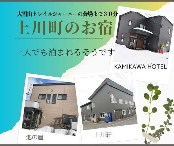 上川町は大会会場に最も近い町ですそこには一人でも泊まれるお宿がありますぜひ検索してお問合せください